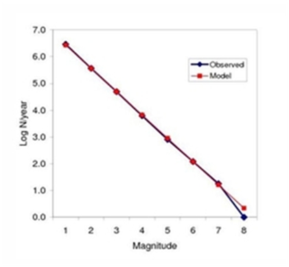 Wikipedia also has a nice graphic to illustrate this distribution. (See the yellow graph Figure 8.) We are awash in phenomena that are power law distributed, e.g. size of earthquakes, intensity of wars, number of acres burned by forest fires, magnitude of stock market crashes, number of criminal acts committed by a person, size of power outages, and a great deal more. What makes power law distributions really interesting is that if we do a log transform we end up with a straight line that shows the relationship between the number of cases and their size. We don’t know the size of the next power outage occur, and we don’t know when the next power outage will occur. But we do know the likelihood that when it does occur, it will be of some particular magnitude. Similarly with earthquakes. See Figure 9.  Depending on what one wants to do with the data, that is quite a high level of predictability.