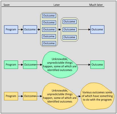Yellow model: The story at the bottom acknowledges more ignorance still. There, not only are the intermediate outcomes tangled with other activity, but the long-range outcome is as well.