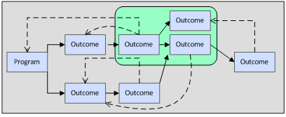 Blue model: The story in this model is that there are outcomes that matter, but whose precise relationships cannot be identified. (See the ovals in the “later”) column. The best we can do is think of these outcomes in groups such that if something happens in one group, something will happen in the subsequent group. This is the best we can do. We cannot specify relationships among single outcomes within each group, or specific outcomes across groups. Also, it is possible that for each replication of the program, the 1:1 relationship within and across groups may differ. Or, there may be no 1:1 relationships at all. Rather, there is emergent behavior in one group that is affecting the other. Or put more simply, the best we can say is that “if stuff happens here, stuff will happen there”.