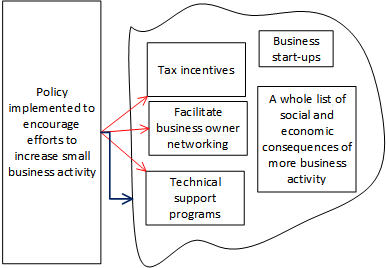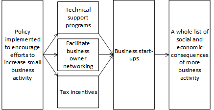 From logic models and depictions of program theory that I have seen, my impression is that policy evaluation is treated as program evaluation. By that I mean that specific consequences are expected from the policy change, and an outcome chain from policy to consequences is constructed. Figure 1 uses Small and medium sized enterprises (SME) as an example of what I mean.