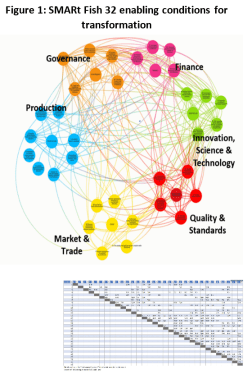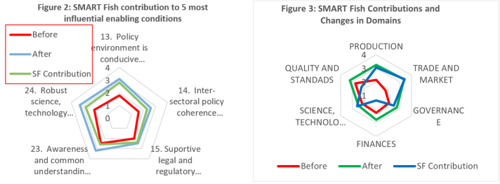 In phase two, the evaluation team convened three stakeholder focus groups, one for each value chain. Each group was asked to rate the state of the 32 enabling conditions before the project started and at the time of project completion. Subsequently, the groups were asked to rate the extent to which SMART- Fish contributed to the changes in these conditions. When aggregating the responses on the three value chains, changes in the enabling conditions to the long-term objectives were most pronounced in the domains of trade and markets, governance, and production (Figure 3). These were three domains that the project targeted and in which stakeholders reported SMART-Fish making substantial contribution.  While the stakeholders acknowledged project contributions in science and technology, the progress made in many of the enabling conditions in this domain was seen as low.  Progress was made in the enabling conditions under the financial domain with no link to the project.