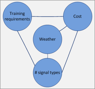Pull just four elements from the list (see the picture): 1) number of signal types detectable, 2) weather,  3) cost, and 4) training requirements. A wider range of detection needs, the ability to work in bad weather, and low training requirements will all increase cost. The ability to work in adverse weather conditions may affect the types of signal detection that can be used. The greater the diversity of information, the greater the training requirements. What would happen to all the tangled dependencies if new hiring drove up the burden on training, or if a need for higher resolution imaging asserted itself, or if requirements for operation in adverse weather conditions were relaxed? Scale this up to dependencies among the seventeen choice criteria, and even a casual look at the dependencies makes it obvious why a strict ordering of criteria is impossible.